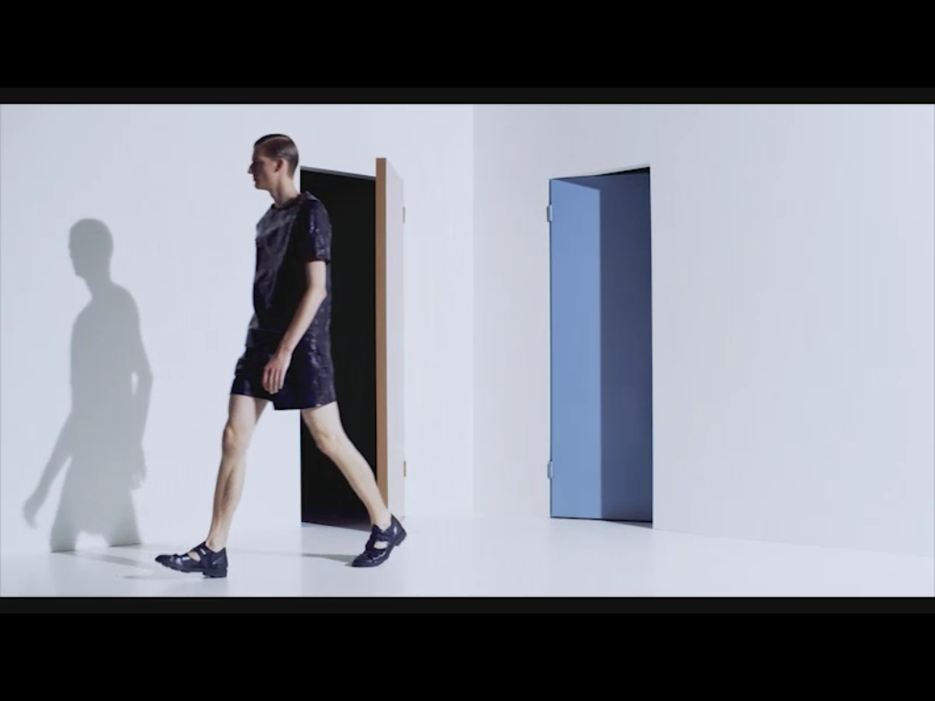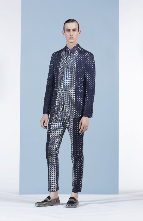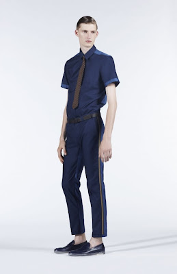 la seta con inserti in pelle nera per i capi eleganti, micro fantasie nei toni del blu e del verde per vestiti a giacca, camicie e bermuda da sovrapporre quasi a formare un mosaico, pantaloni con bande laterali stampate con materiali tecnici che si ritrovano come intarsi nelle camicie e nelle cravatte ...